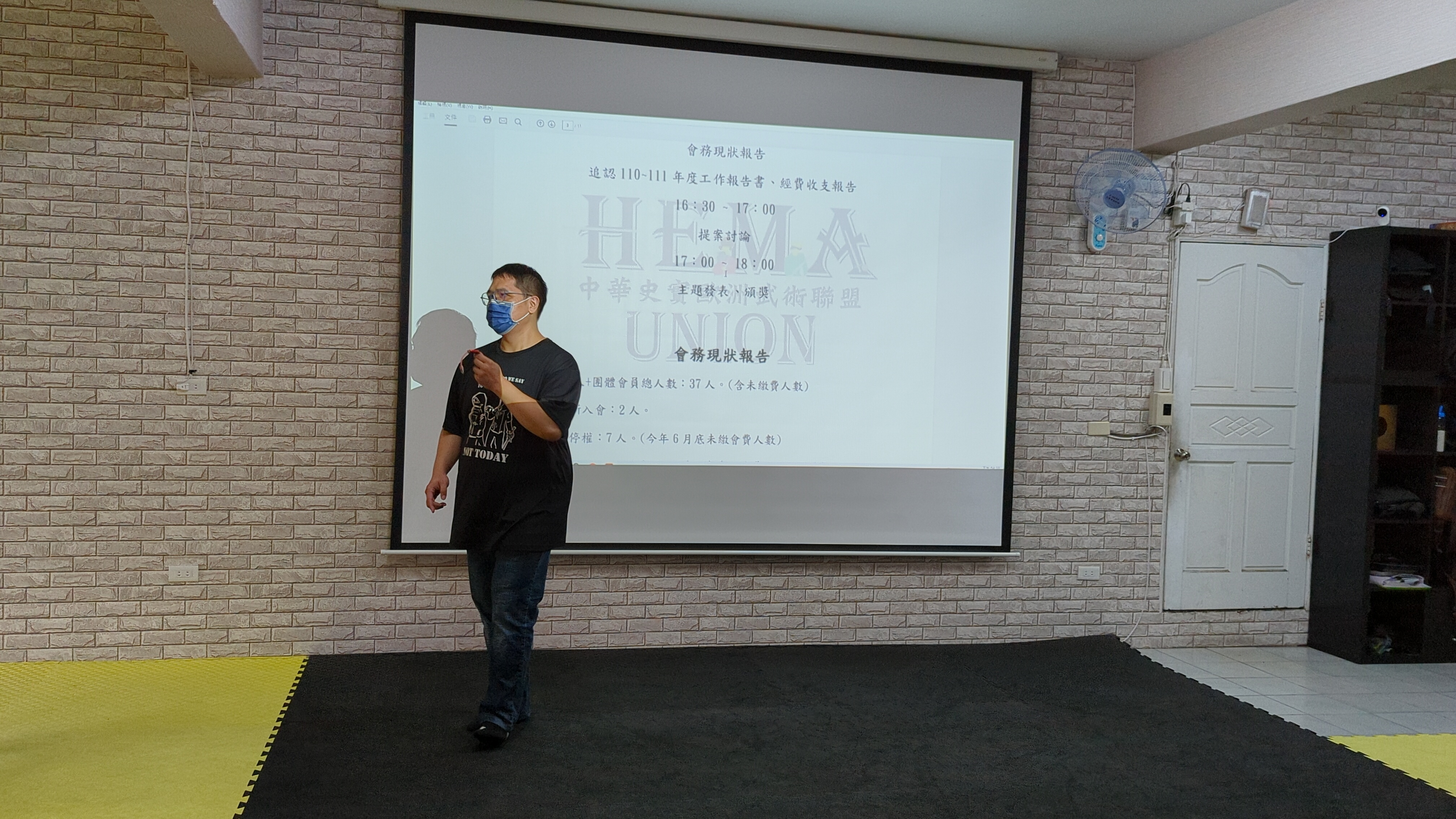 理事長 方子平:111度工作報告:在4月時試辦了小型的劍術研討會。主要內容是史實技法以及現代比賽技巧。主講人是伊塞爾教練以及郭柏岑教練。原定5月舉行的Clash of Steel延後到10月辦理。再來還有輔大盃、另外也開始發送協會電子報給所有的會員,接下來就是今天的會員大會。