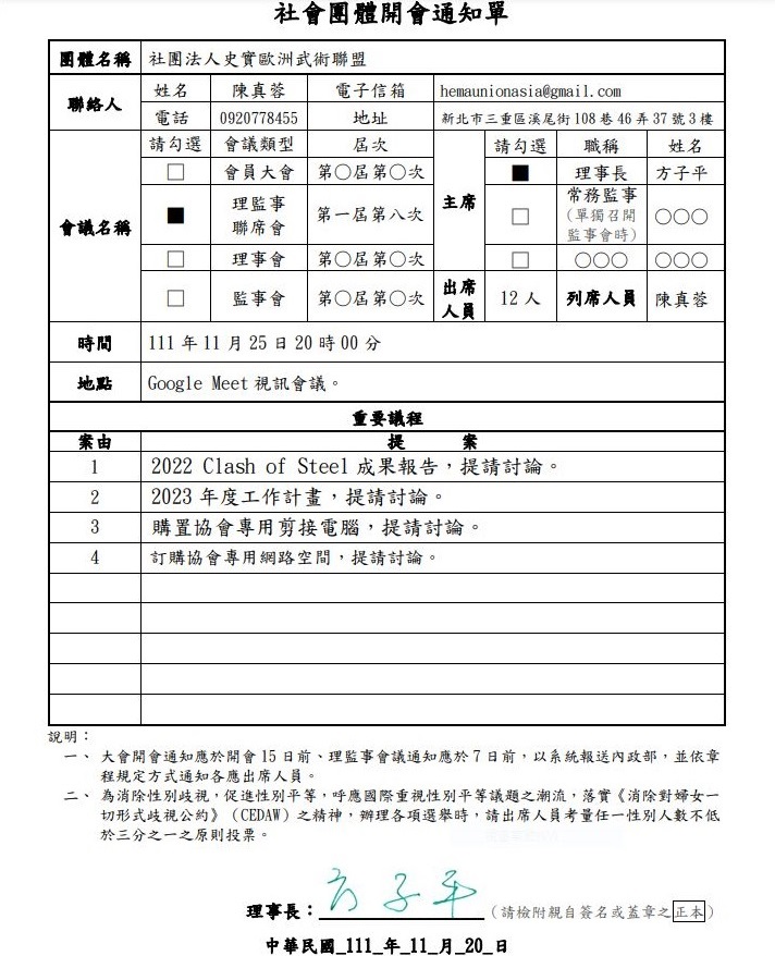 開會通知,會務訊息開會通知-第一屆第八次理監事聯席會議 各位理監事成員11/25 (五) 晚上8點整 舉行第八次聯席會議!議程說明如下。 議題內容如上,開會通知亦已報送內政部系統。 探索更多來自 社團法人史實歐洲武術聯盟 的內容 訂閱即可透過電子郵件收到最新文章。 輸入你的電子郵件地址… 訂閱 分享此文: 按一下即可分享至 X(在新視窗中開啟) X 按一下以分享至 Facebook(在新視窗中開啟) Facebook 喜歡 正在載入... 相關