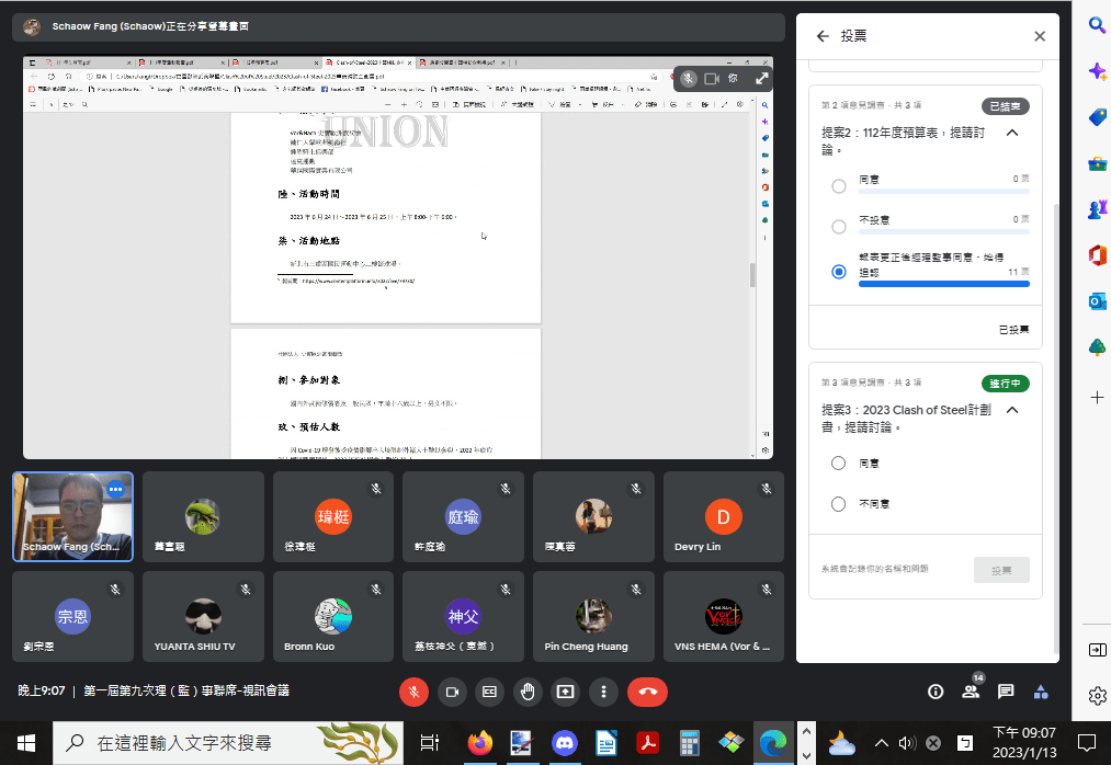 理事長 方子平:請各位開檔案,大家有先看過檔案了吧,有找到需要修正的地方嗎?活動預計在6/24-6/25。因為達克運動6月檔期較滿,無法支援直播設備,若賽事直播改成只播決賽,以目前手邊的資源是沒問題的。