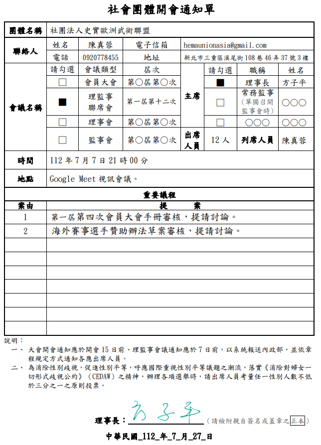 開會通知,會務訊息開會通知-第一屆第十二次理監事聯席會議 各位理監事成員8/4 (五) 晚上9點整 舉行第12次聯席會議!議程說明如下。 議題內容如上,開會通知亦已報送內政部系統。 探索更多來自 社團法人史實歐洲武術聯盟 的內容 訂閱即可透過電子郵件收到最新文章。 輸入你的電子郵件地址… 訂閱 分享此文: 按一下即可分享至 X(在新視窗中開啟) X 按一下以分享至 Facebook(在新視窗中開啟) Facebook 喜歡 正在載入... 相關