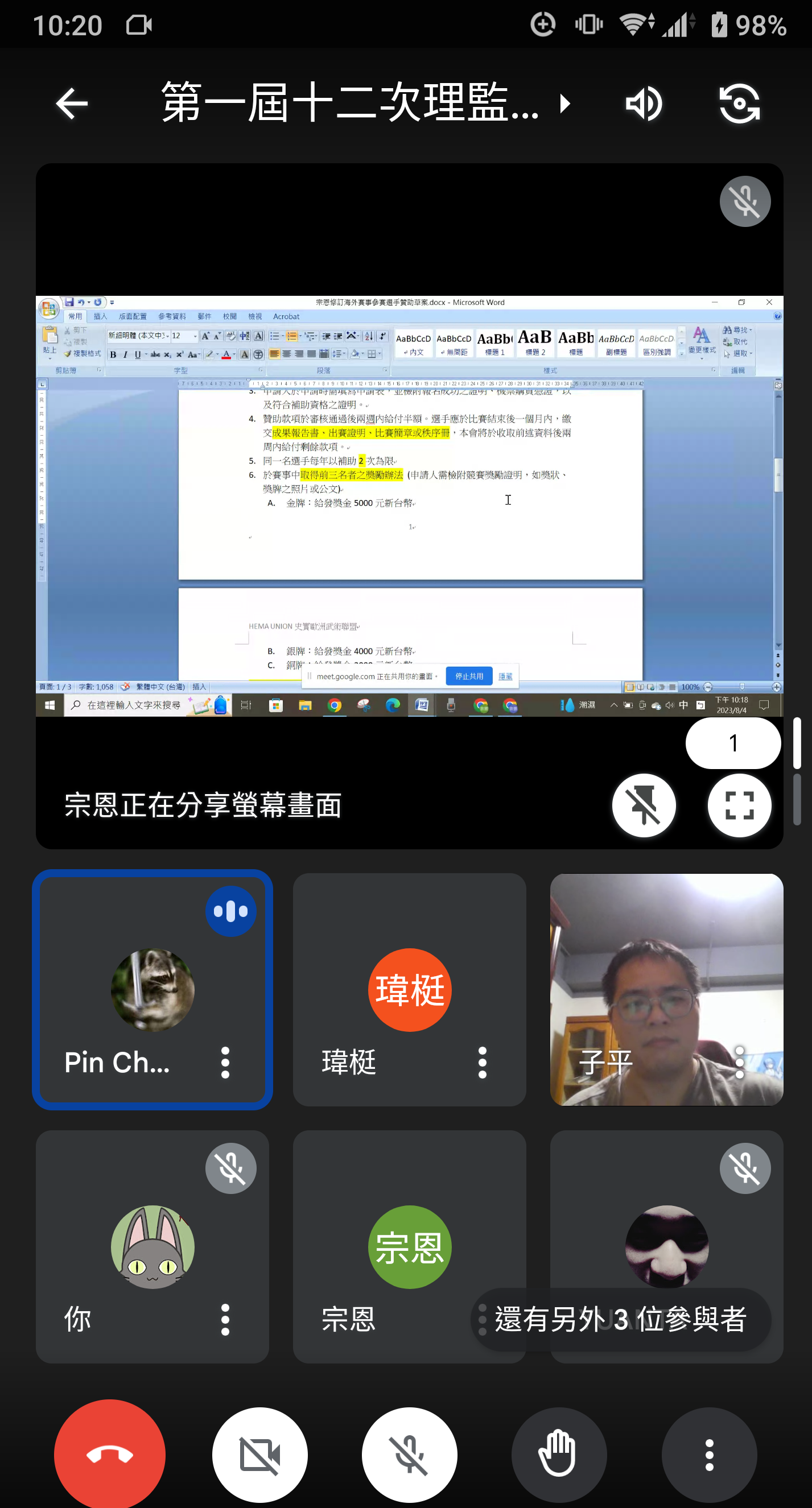 理事 劉宗恩:那我們有需要在辦法上,註明說需要達某一個參賽人數以上嗎?因為這個可以分兩個部分。一個是選手申請,另外一個是選手拿競賽獎金,也就是前三名。參賽的部分我還沒有想得很清楚,但是如果這個比賽一組四個人,或者說誇張一點一組三個人、兩個人,那他是不可以去申請前三名的獎勵辦法,我自己是這樣覺得。
