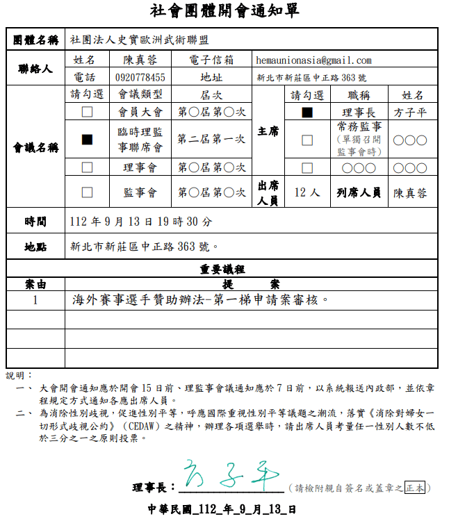 開會通知,會務訊息開會通知-第二屆第一次臨時理監事聯席會議 各位理監事成員9/17 (日) 晚上7點半 舉行臨時理監事聯席會議!議程說明如下。 議題內容如上,開會通知亦已報送內政部系統。 2025近期活動表 探索更多來自 社團法人史實歐洲武術聯盟 的內容 訂閱即可透過電子郵件收到最新文章。 輸入你的電子郵件地址… 訂閱 分享此文: 按一下即可分享至 X(在新視窗中開啟) X 按一下以分享至 Facebook(在新視窗中開啟) Facebook 喜歡 正在載入... 相關