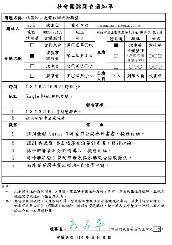 開會通知開會通知-第二屆第4次理監事聯席會議 各位理監事成員6/16 (日) 晚上9點整 舉行第4次聯席會議!議程說明如下。 議題內容如上,開會通知亦已報送內政部系統。 探索更多來自 社團法人史實歐洲武術聯盟 的內容 訂閱即可透過電子郵件收到最新文章。 輸入你的電子郵件地址… 訂閱 分享此文: 按一下即可分享至 X(在新視窗中開啟) X 按一下以分享至 Facebook(在新視窗中開啟) Facebook 喜歡 正在載入... 相關