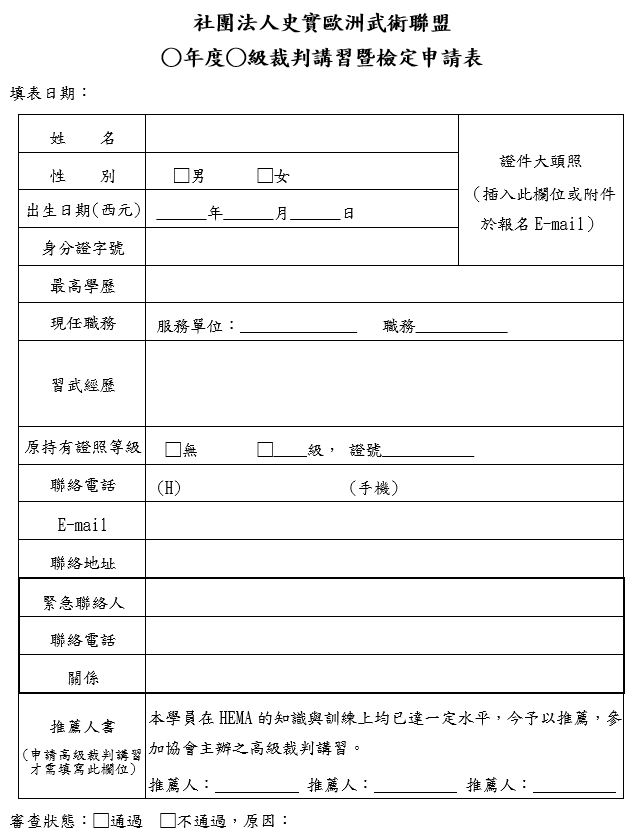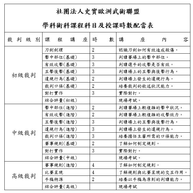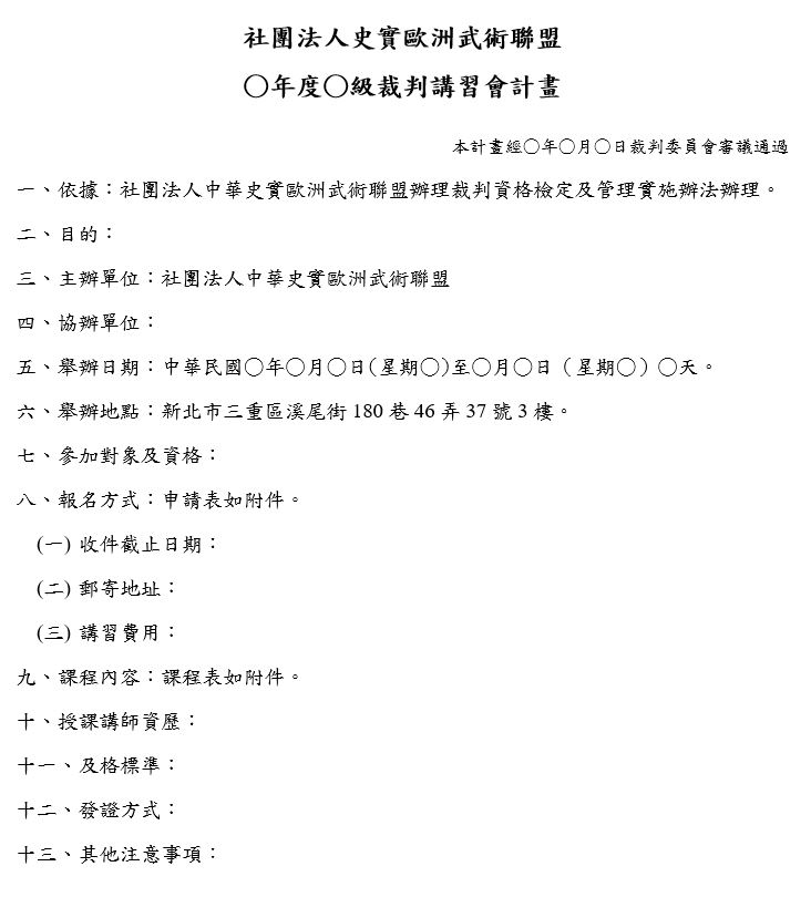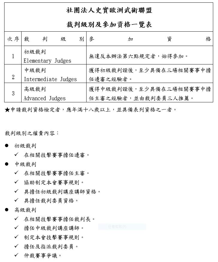 - 目的:社團法人中華史實歐洲武術聯盟(以下簡稱本會)為建立健全史實歐洲武術(HEMA)比賽裁判制度,提高裁判素質及培訓人才,特訂定裁判資格檢定及管理實施辦法(以下簡稱本辦法)。